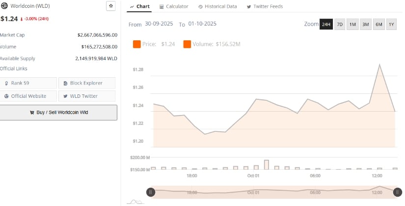 BraveNewCoin сообщает, что Worldcoin торгуется по цене $1.24, что является снижением на 3.00% за 24 часа — падение настолько крутое, что это практически прыжок со скалы. Его рыночная капитализация? Скромные $2.67 миллиарда, что ставит его на 59-е место среди криптовалют, как будто криптомир — это конкурс популярности. 🎭